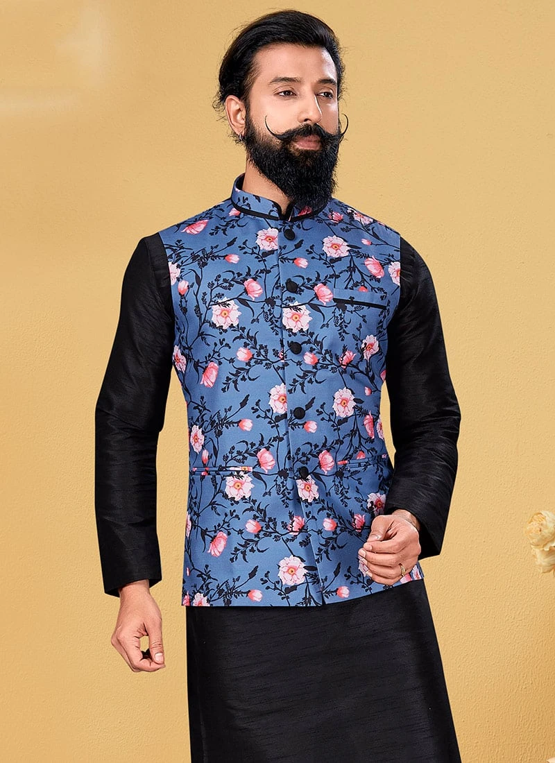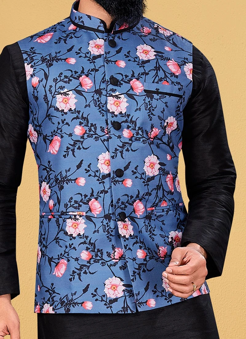 Fashion and pattern could be at the peak with this aegean blue cotton nehru jacket. The floral printed work with over the jacket crafted with collar neck and sleevless with pockets looking charm.