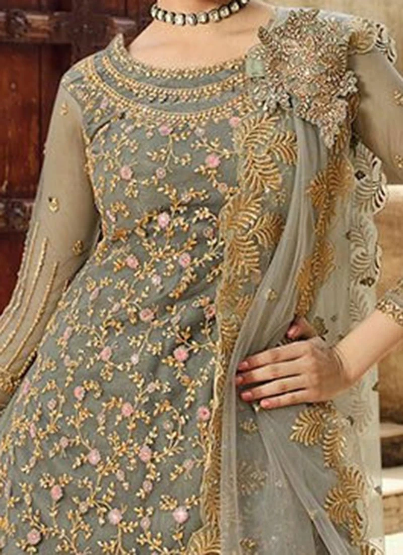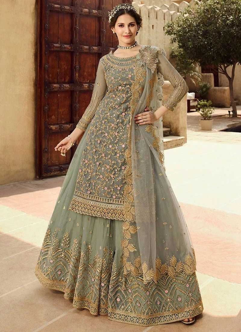 Amyra Dastur Grey Net Embroidered A Line Lehenga Wedding Wear