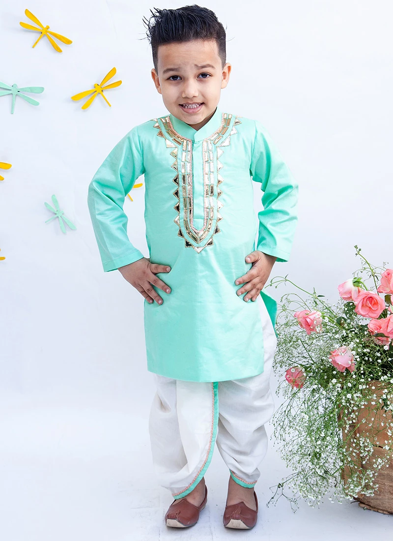 Style and trend will be at the peak in this aqua green cotton silk boys kurta pyjama. It looks chic and ideal for any affair crafted with full sleeves and collar neckstyle . Comes with white cotton silk dhoti bottom.