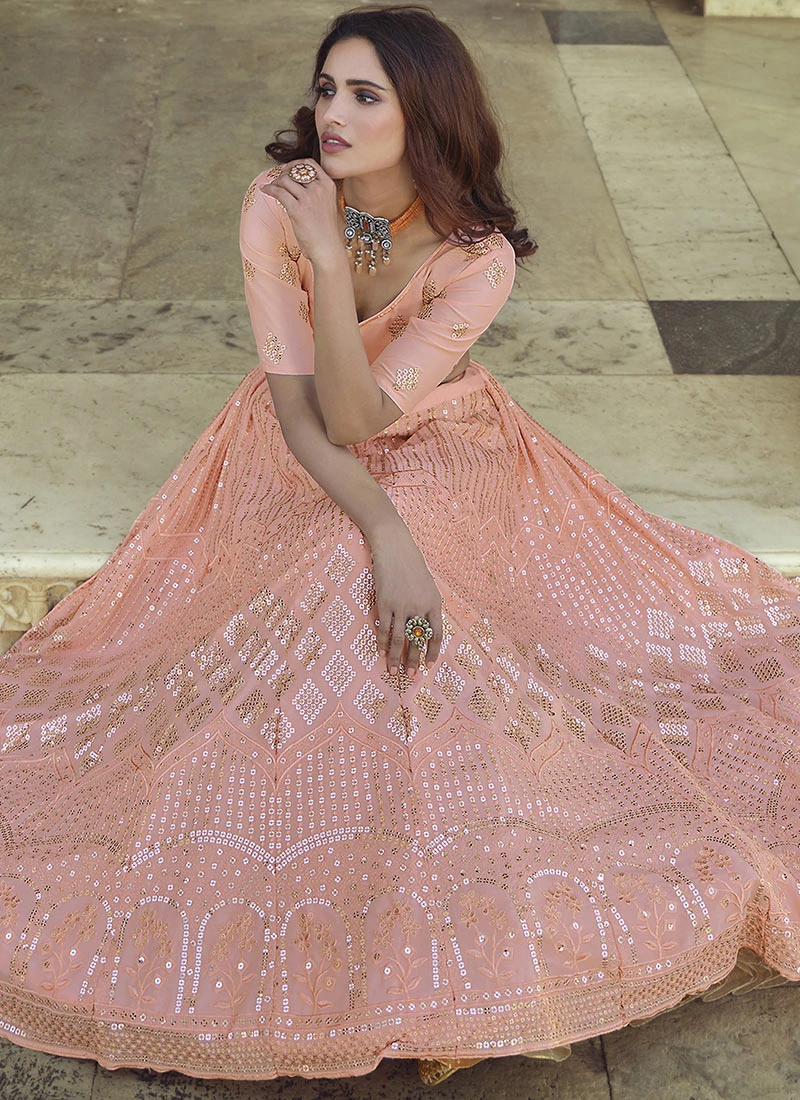 Ballet Pink Georgette Sequins Embroidery Umbrella Lehenga Wedding Wear