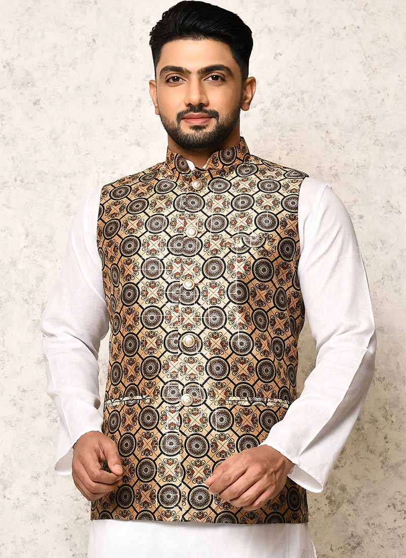 Shine brighter as you wear this pretty beige art silk nehru jacket crafted with mandarin collar neck and sleeveless enriched with printed work is representing royalty in itself.