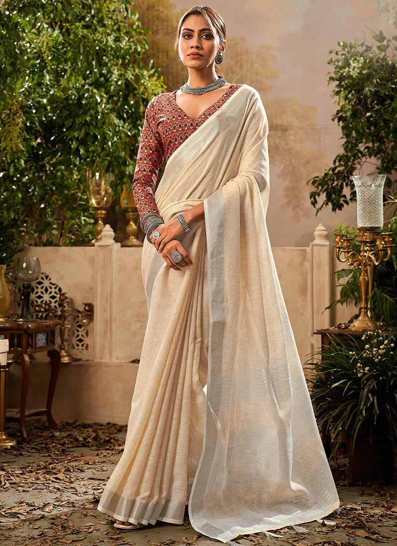 The saree features a soft and luxurious blend of cotton creating a fabric that is both comfortable and elegant. The beige hue of the saree lends it a subtle understated charm making it suitable for a variety of occasions. Whether its a festive celebration a wedding or a formal event this saree is sure to make a statement.
