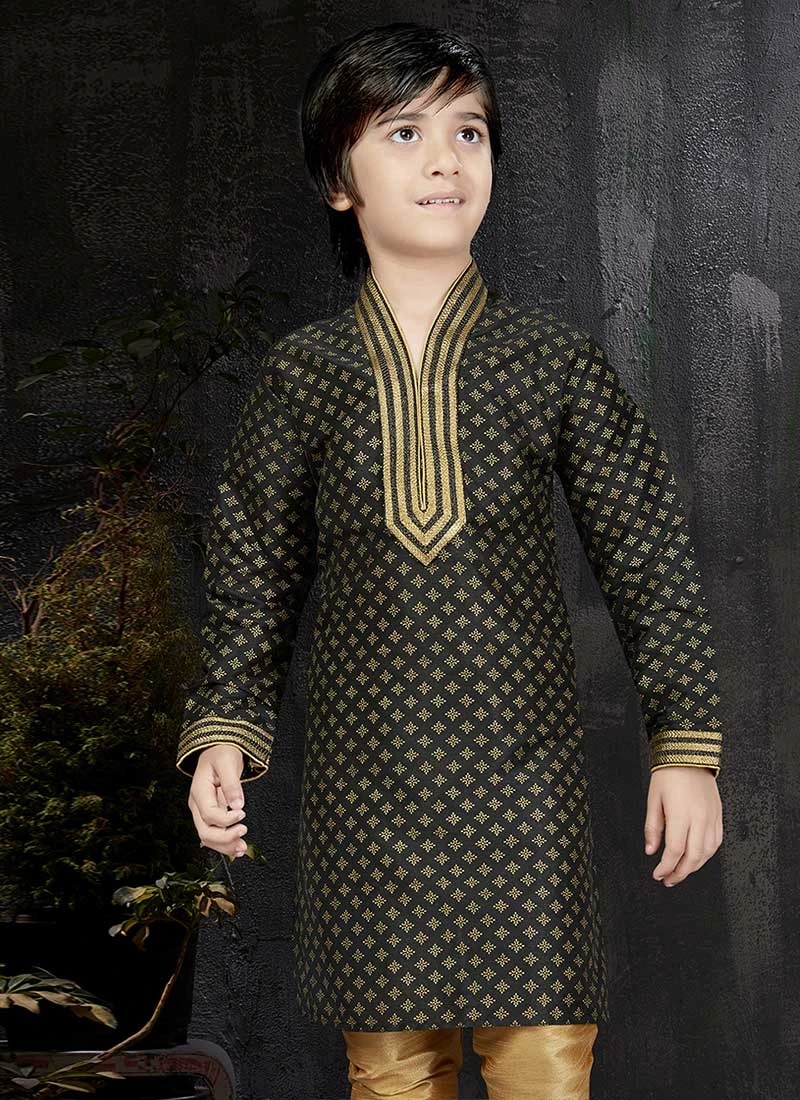 Black art dupion silk kids kurta pyjama set with embroidered stripes on the yoke, sleeve cuffs and printed foliage motifs all over the kurta. Comes with matching bottom.