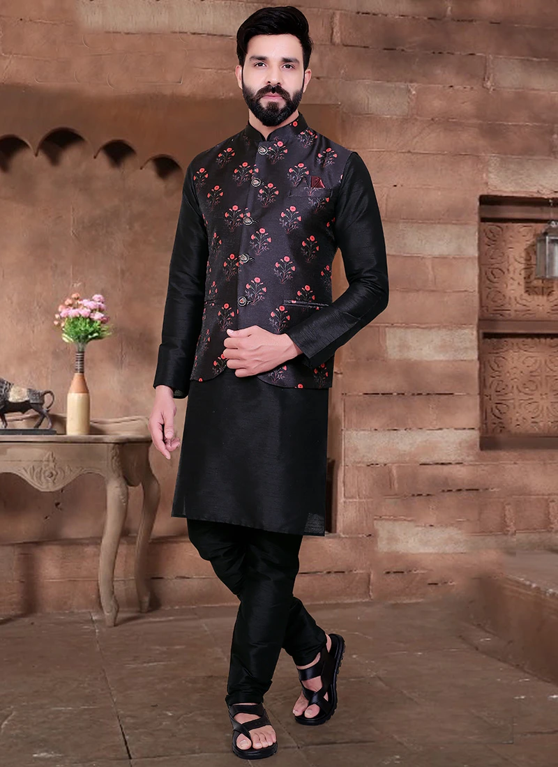 Be your very own style diva with this black art silk nehru jacket crafted with mandarin collar neck and sleeveless enriched with digital printed work is representing royalty in itself.