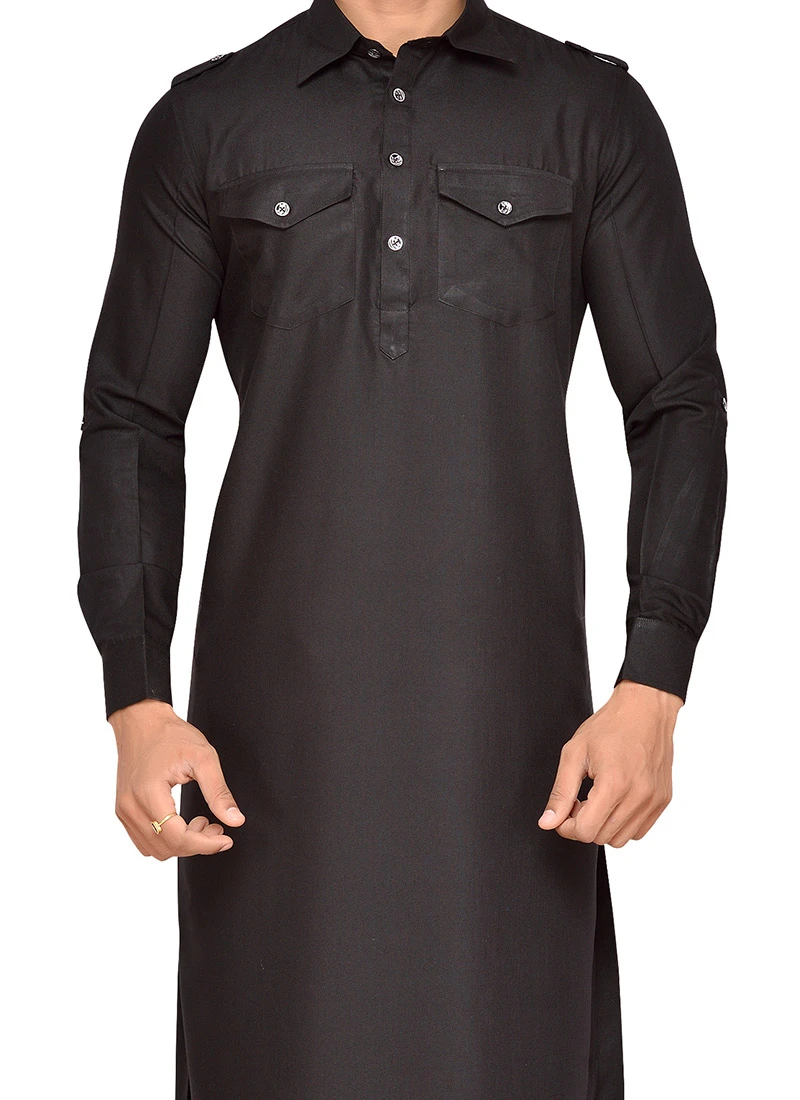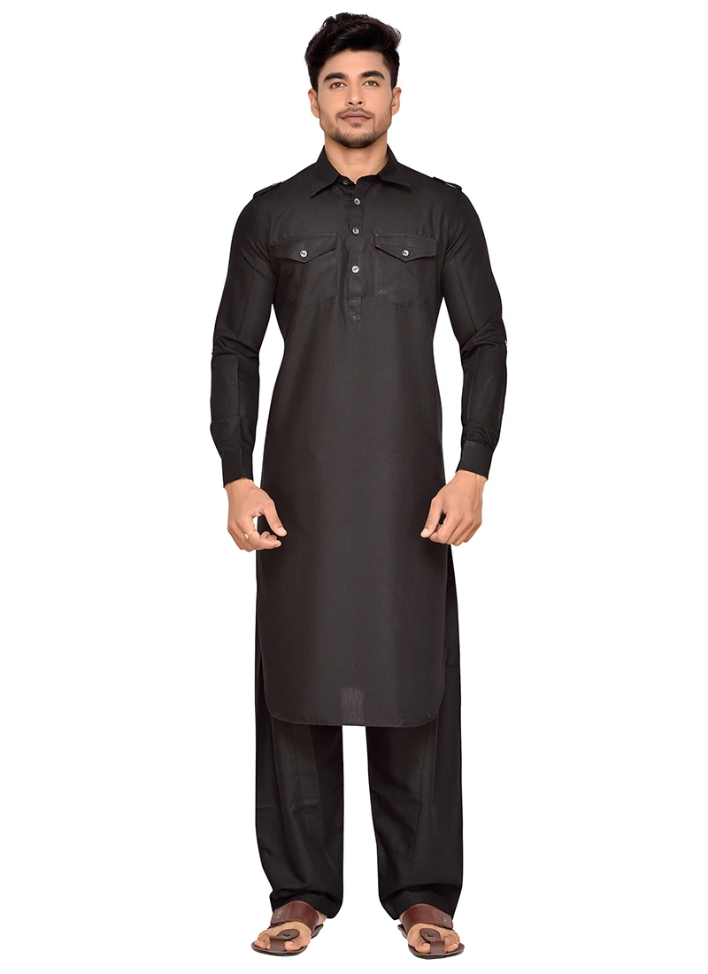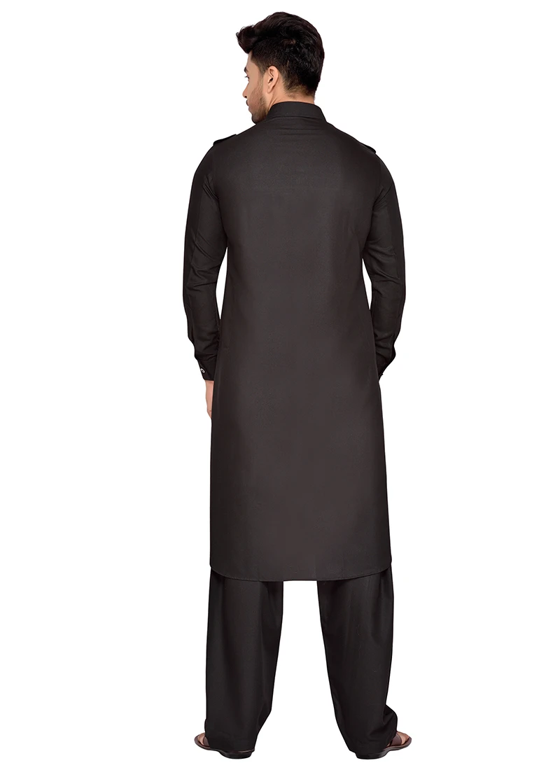 Black art silk plain structred pathani set with side square pockets on it. Comes with matching bottom.