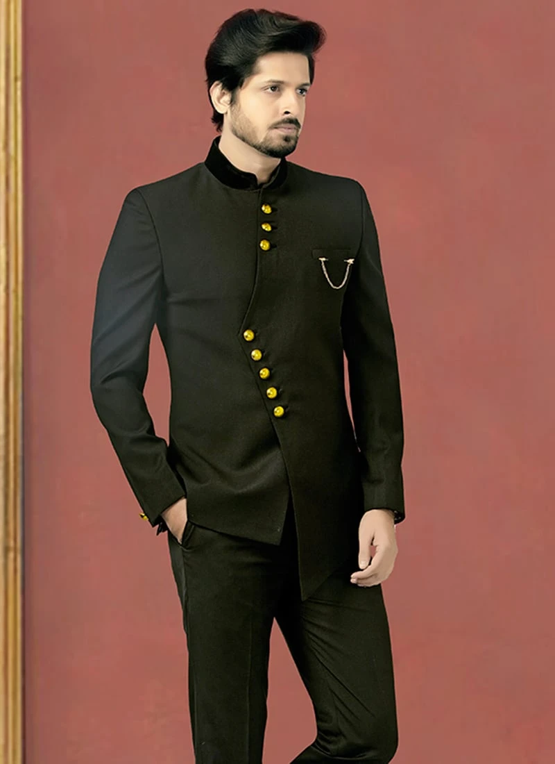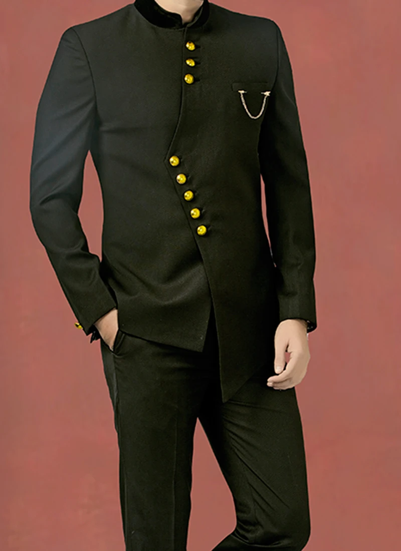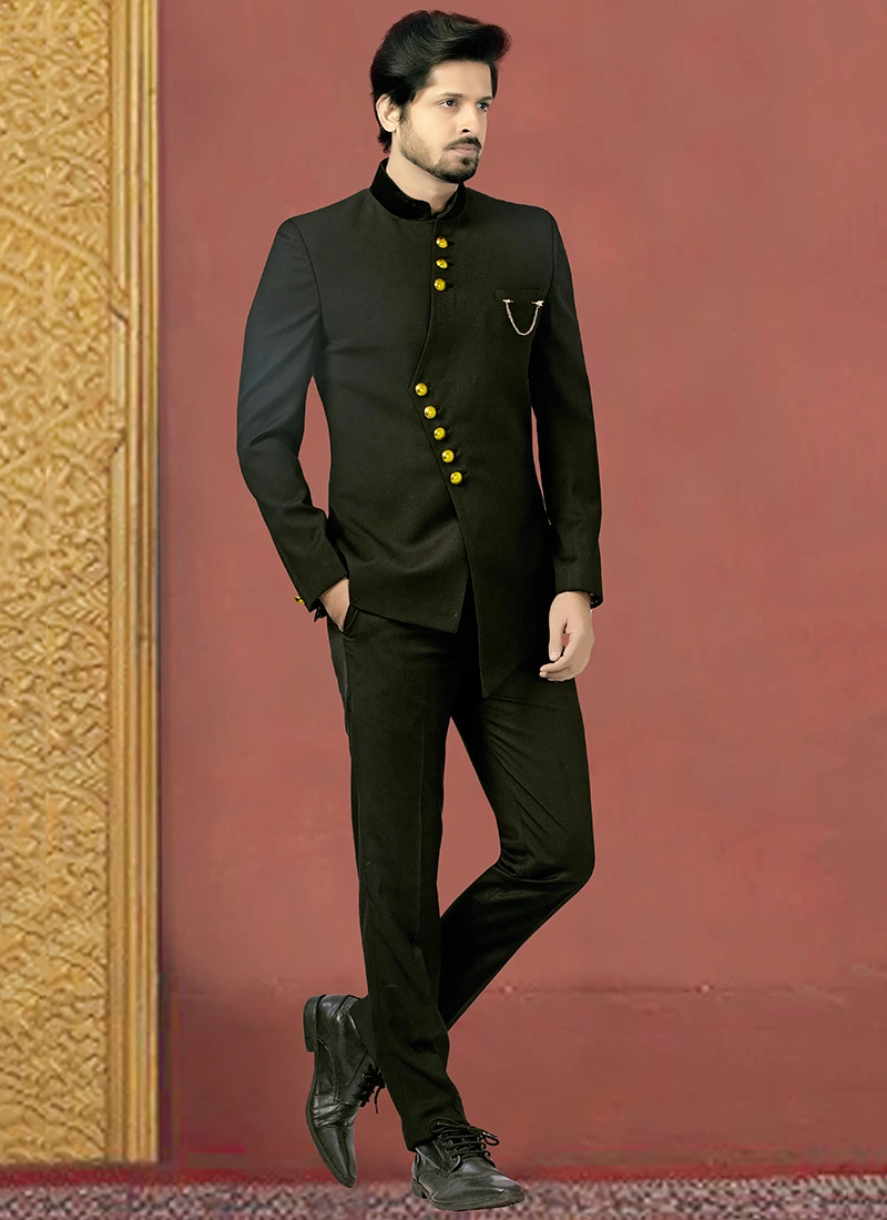 Black blended cotton bandhgala suit with decorative buttons and side pocket.Comes with matching black bottom.