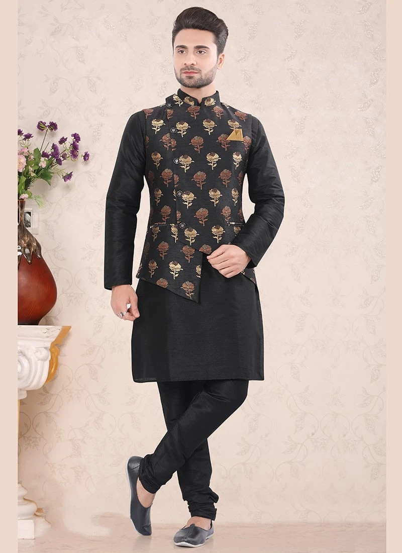 Create a smoldering impact by this black benarasi brocade nehru jacket crafted with mandarin collar neck and sleeveless enriched with brocade printed work is representing royalty in itself.