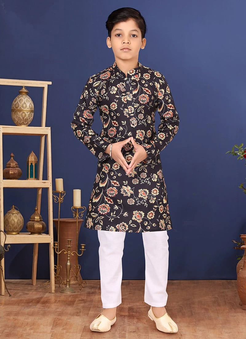 True style will come out of your dressing style and design with this Black cotton boys kurta pyjama enriched with printed work with floral design crafted with close collar neck and full sleeves is representing a royalty in itself. This kurta pyjama comes with white cotton chudi pant bottom.