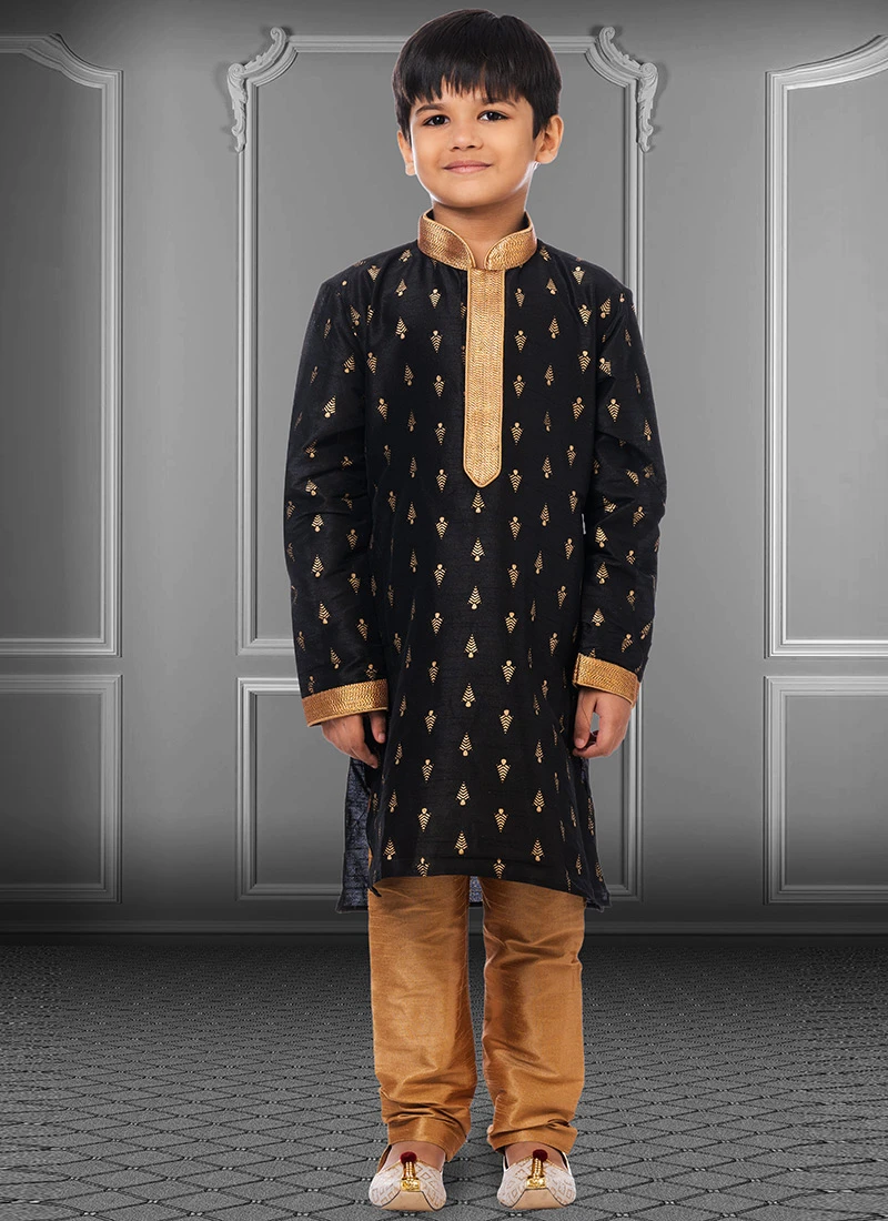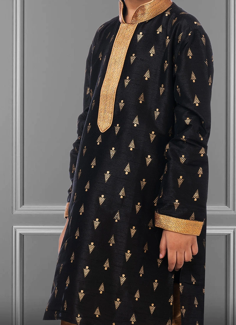 Black Dhupion Silk Foil Printed Boys Kurta Pyjama Party Wear