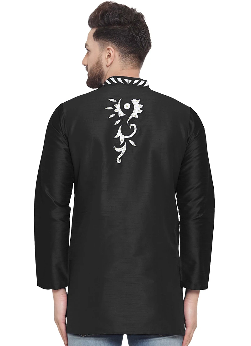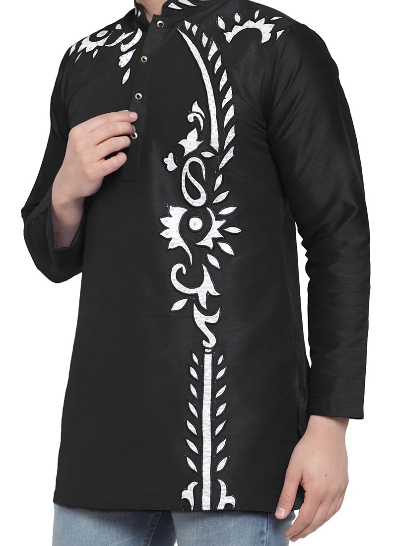 Black dupion silk kurta is fashioned with embroidered work that completes the look.