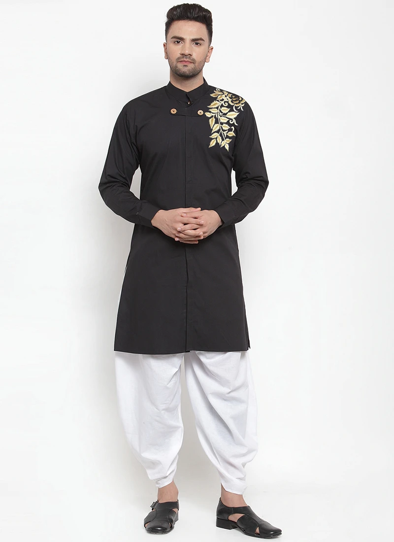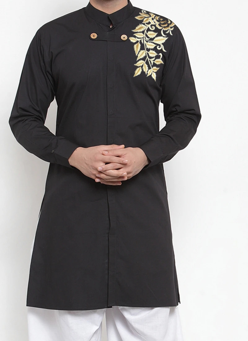 Be your own style icon in this black cotton indowestern kurta enriched with embroidered work and crafted with full sleeves and collar neckstyle is representing a royalty in itself.