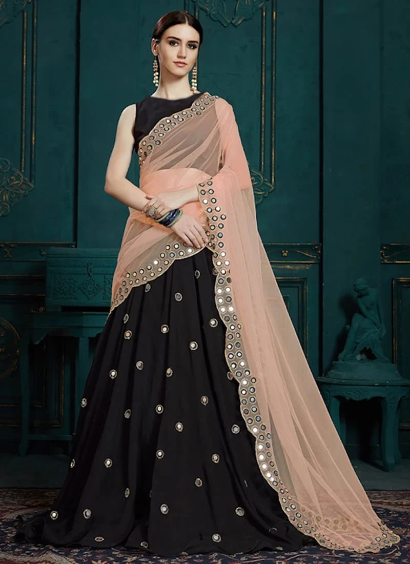 This product consists of semistitched lehenga, choli and dupatta fabric. This can be stitched using the custom tailoring options below. To buy semi-stitched fabric, just choose the unstitched option.