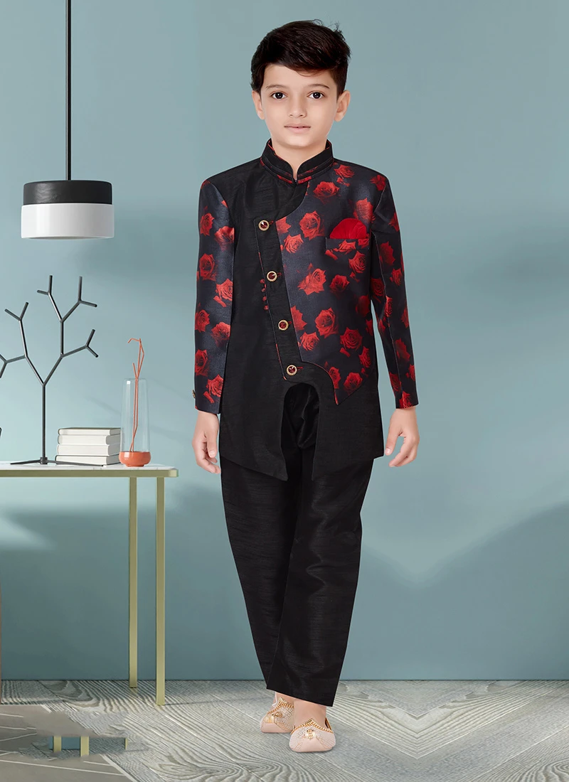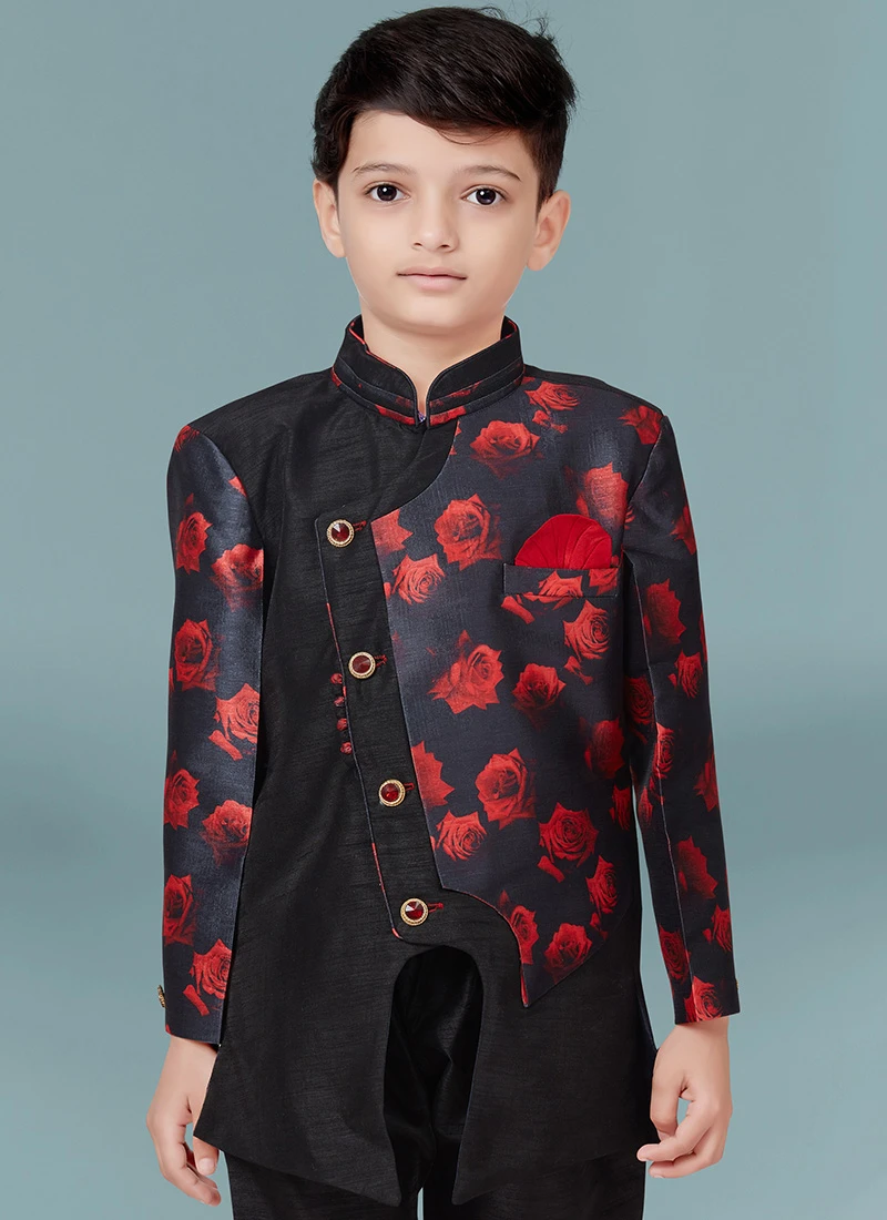 Black Jacquard Silk Printed Work Indowestern Sherwani Party Wear