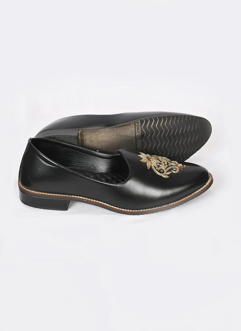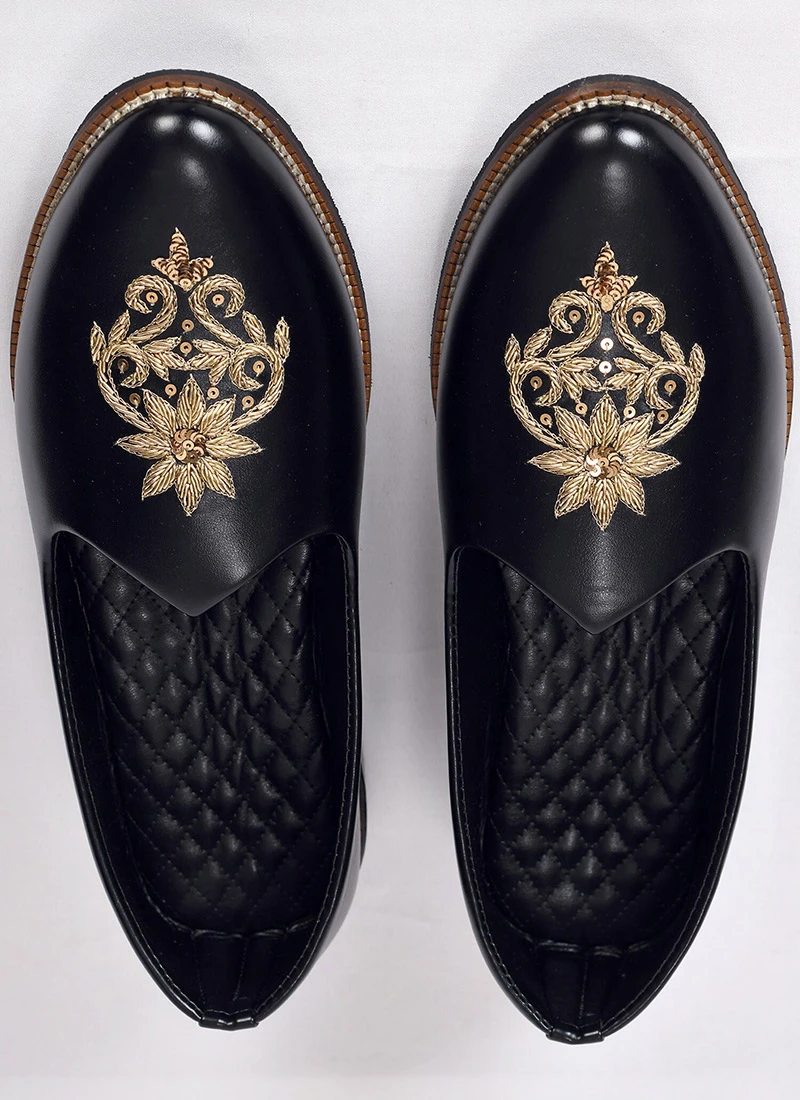 Look stunning in this black color leather mojris embellished with hand work look classic.