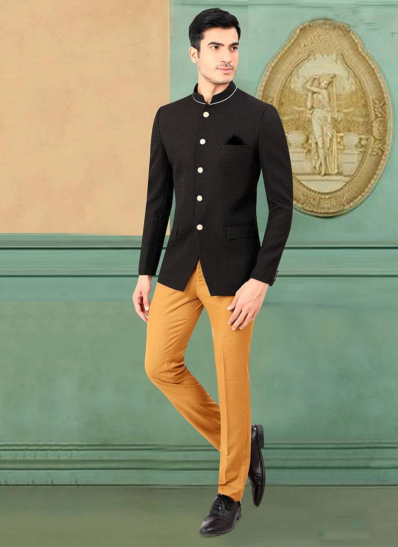 Be the centre of attention in this black color terry rayon bandhgala suit. This suit comes with some designs and crafted with collar neck and full sleeves looks desirable. This suit comes with beige terry rayon pant bottom.