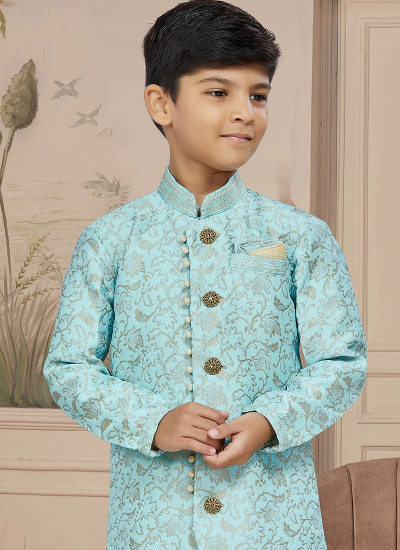 Blue Art Silk Embroidered Indowestern Sherwani For Boys Festive Wear