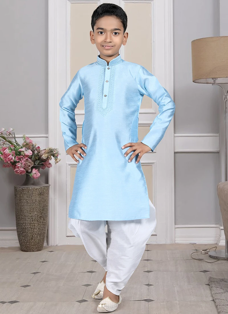 Be your own style icon in this blue color art silk kurta pyjama enriched with embroidered work and crafted with collar neck and full sleeves look desirable. Comes with cream color art silk dhoti bottom.