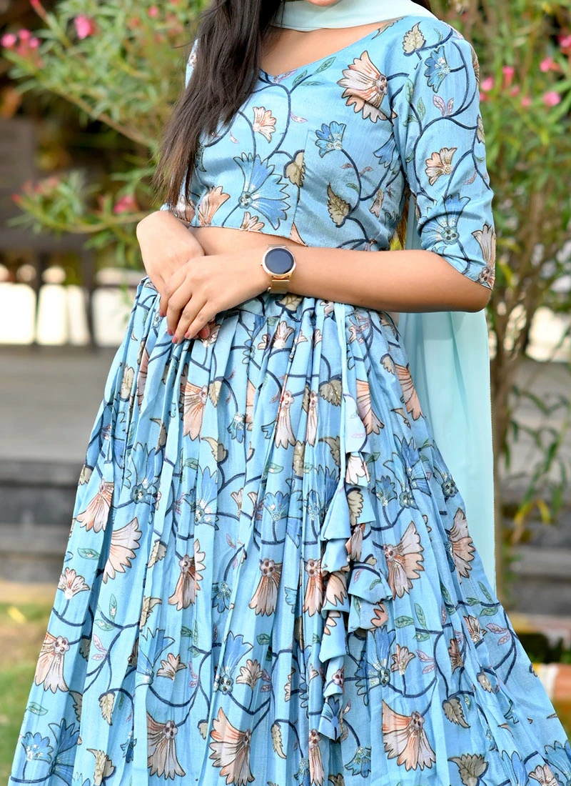 The lehenga features a striking umbrellastyle silhouette. The term umbrella refers to the flared and voluminous nature of the lehenga skirt which flares out beautifully from the waist and creates a mesmerizing twirlworthy effect. The blue Chinon fabric is adorned with an intricate print inspired by traditional Indian motifs. These prints which may include floral patterns paisleys or geometric designs are carefully chosen to add depth and dimension to the outfit. The fusion of contemporary and traditional elements in the print is a nod to the rich heritage of Indian fashion.
