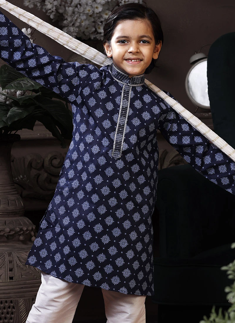 Navy Blue Jacquard Silk Boys Indowestern Sherwani Party Wear