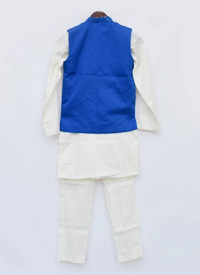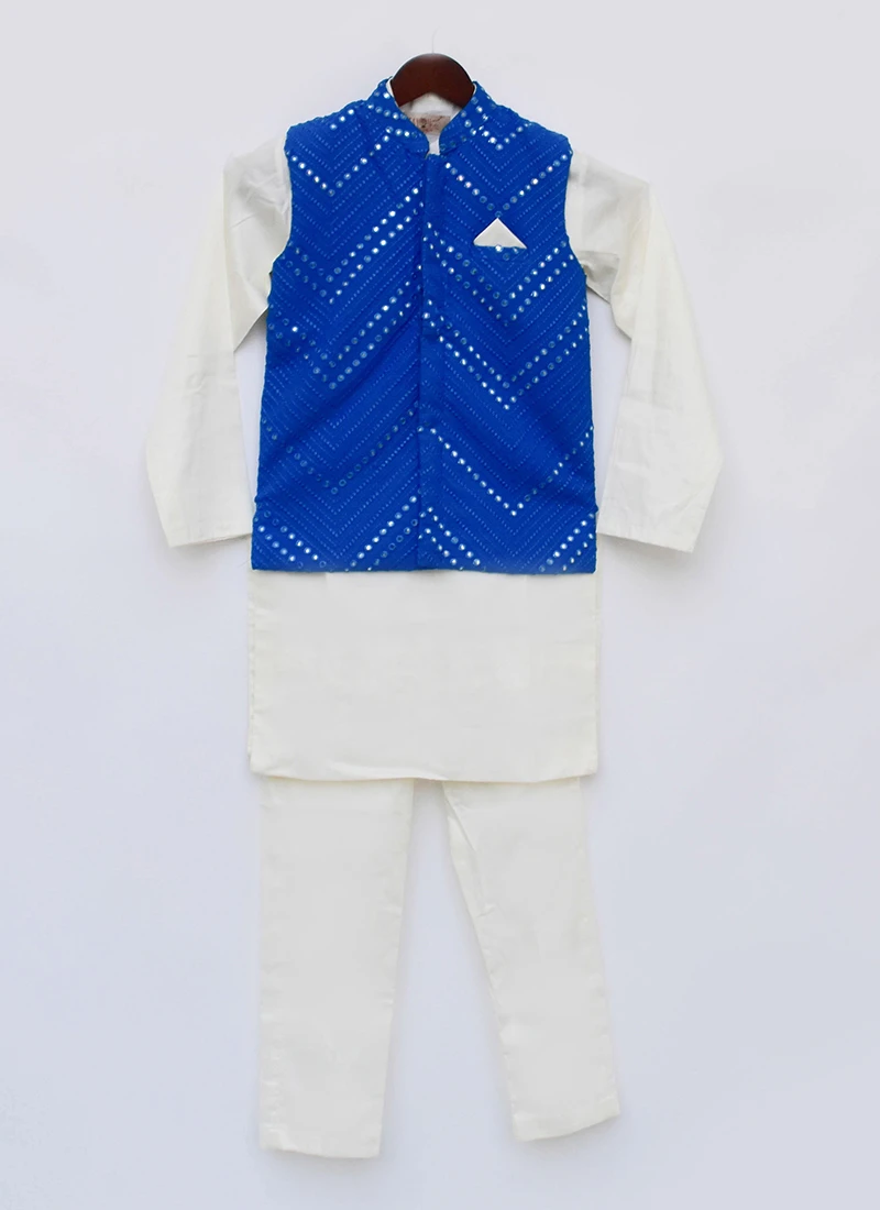 Be fascinating your boy in this white cotton silk boys bandi set will make you stylish with full sleeves and mandiran collar neckstyle looks chic. This set comes with white cotton silk straight pant bottom and with royal blue cotton silk with mirror embroidered work nehru jacket.