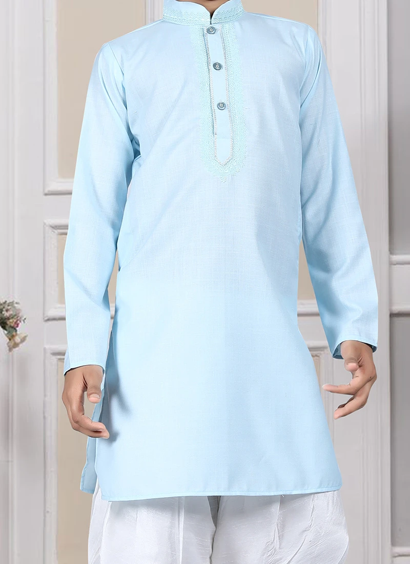 Look stylish in this readymade blue color cotton kurta pyjama enriched with plain work and crafted with collar neck and full sleeves looks pretty. Comes with cream color art silk dhoti bottom.