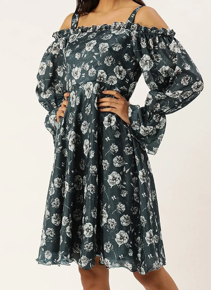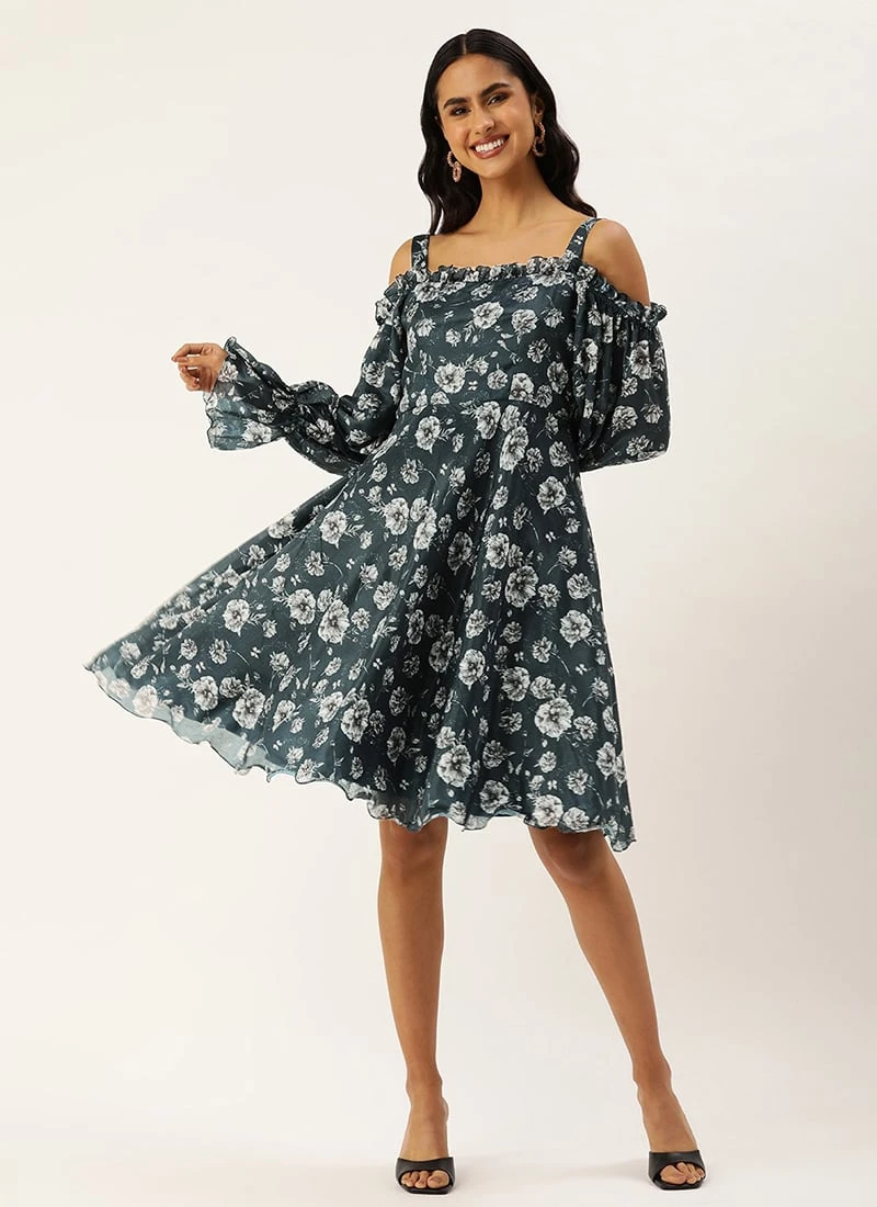 Blue Digital Printed Chinon Dress Party Wear