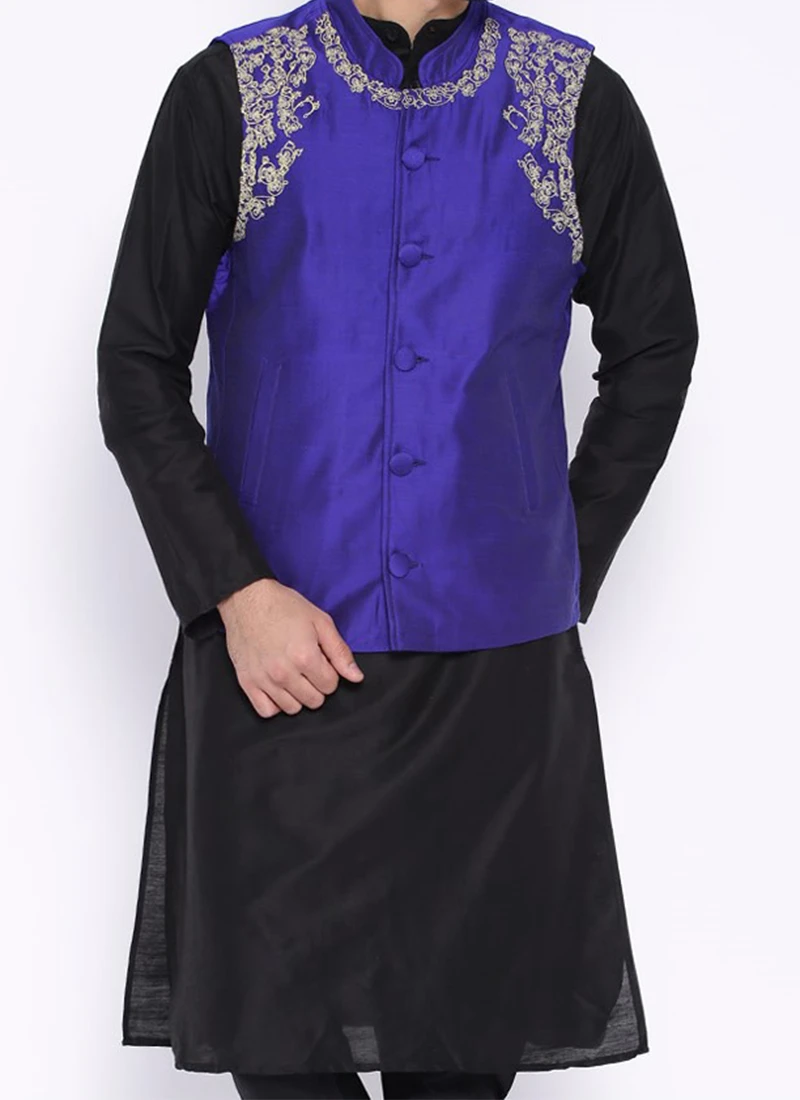 An remarkable Blue dupion silk fabric Nehru Jacket will make you appear highly stylish and graceful. This attire is encrafted with embroidered work with pockets.