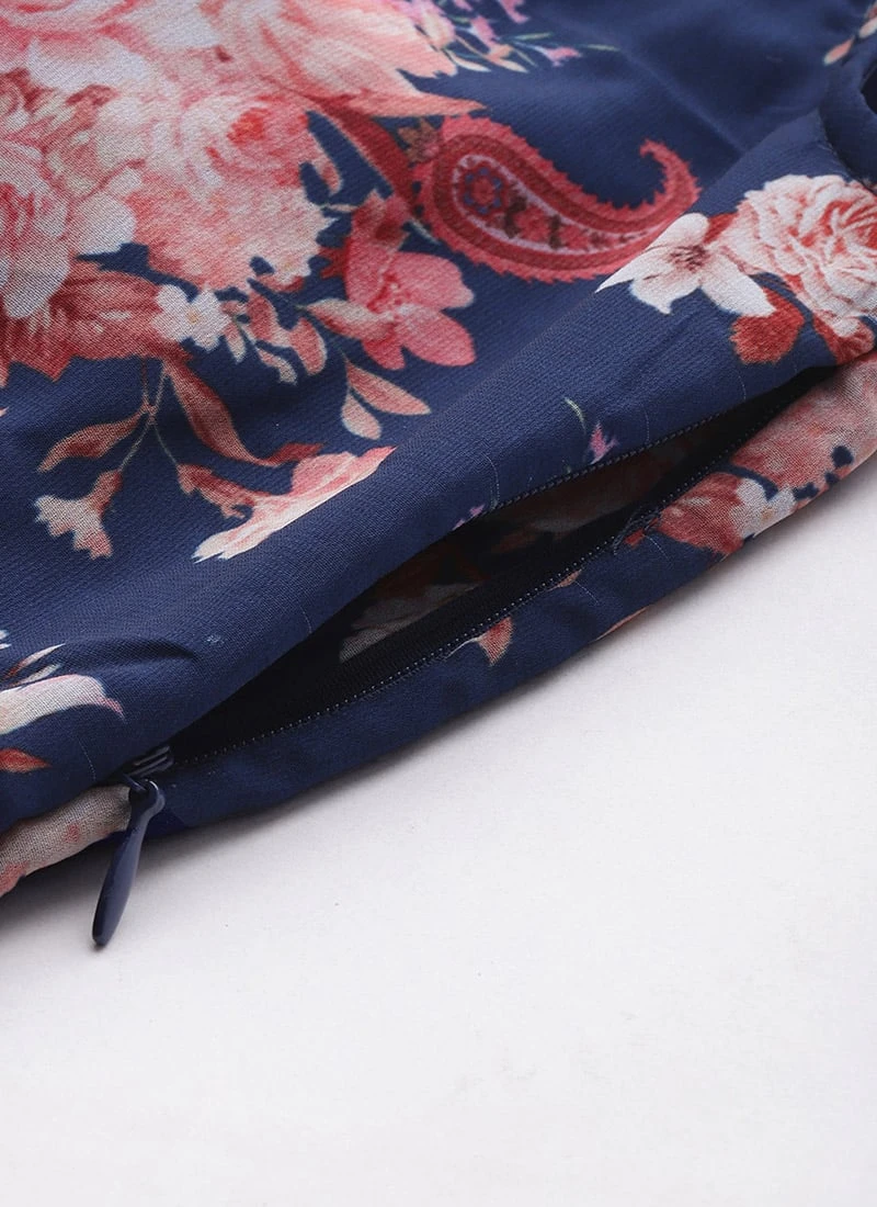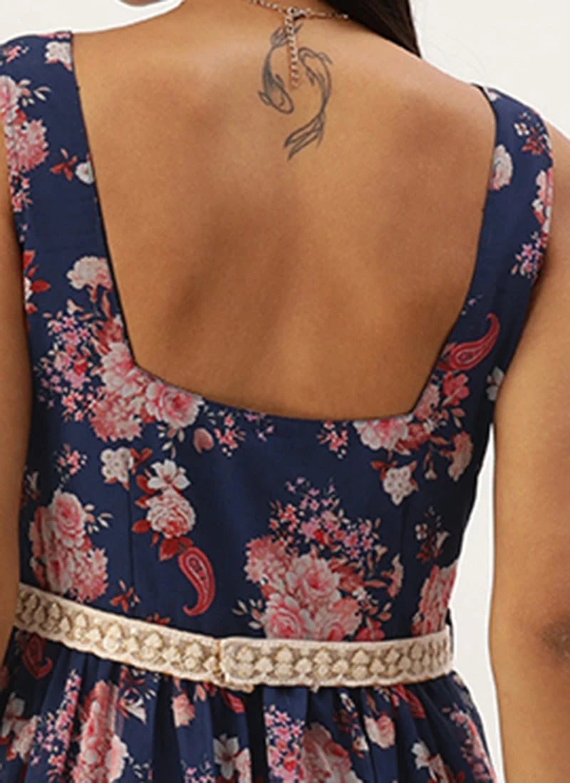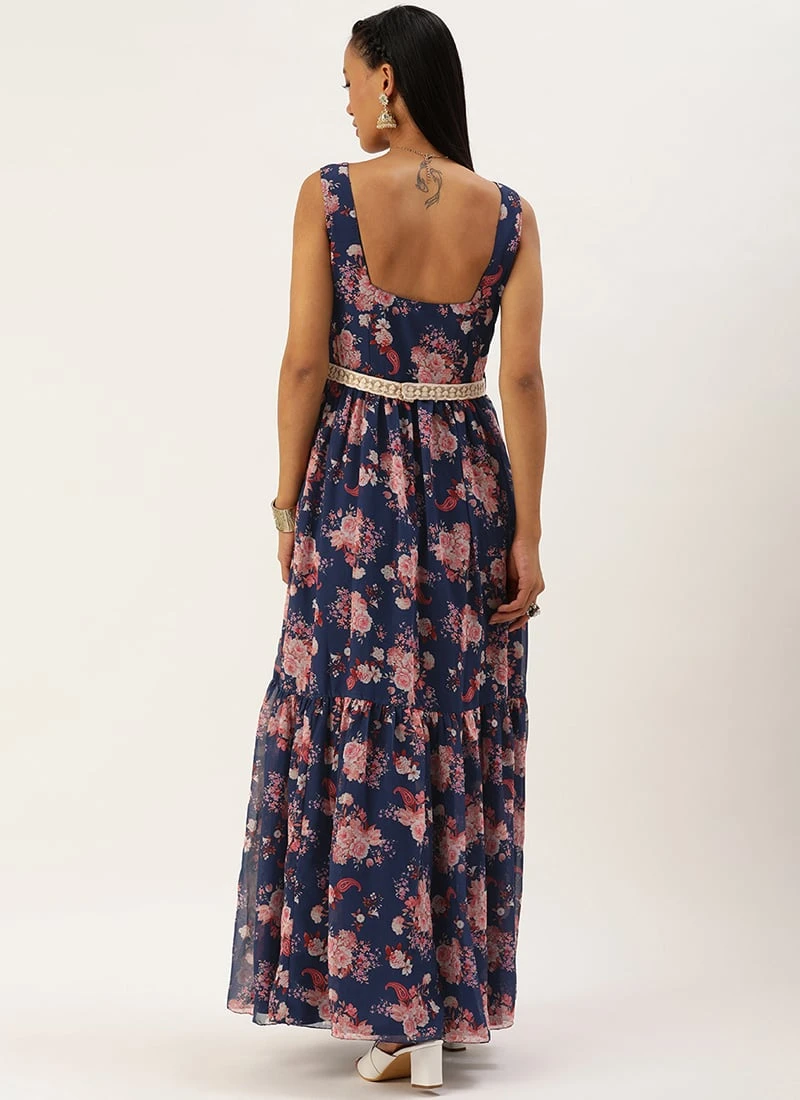 Blue Georgette Digital Printed Tiered Dress Festive Wear