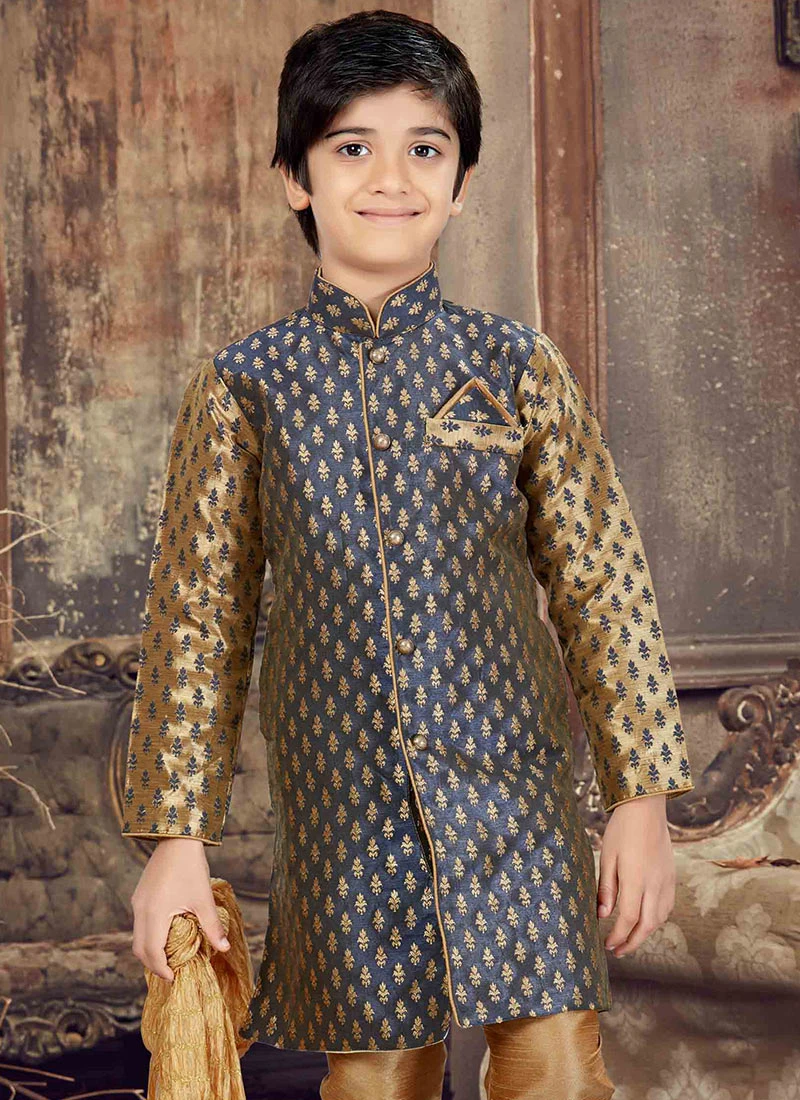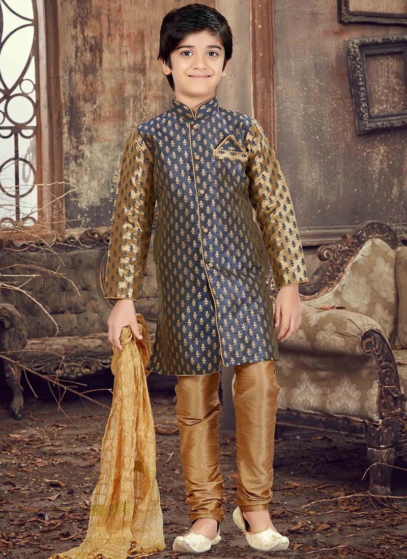 Navy Blue Jacquard Silk Boys Indowestern Sherwani Party Wear