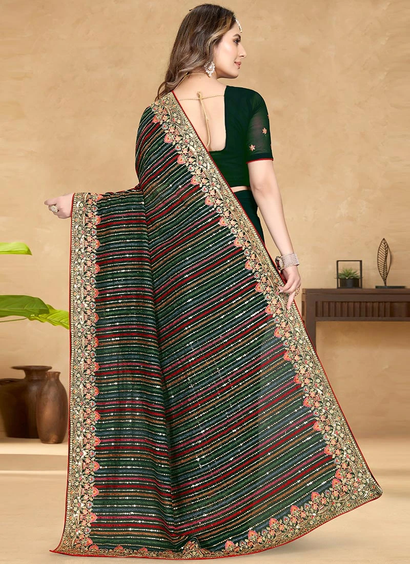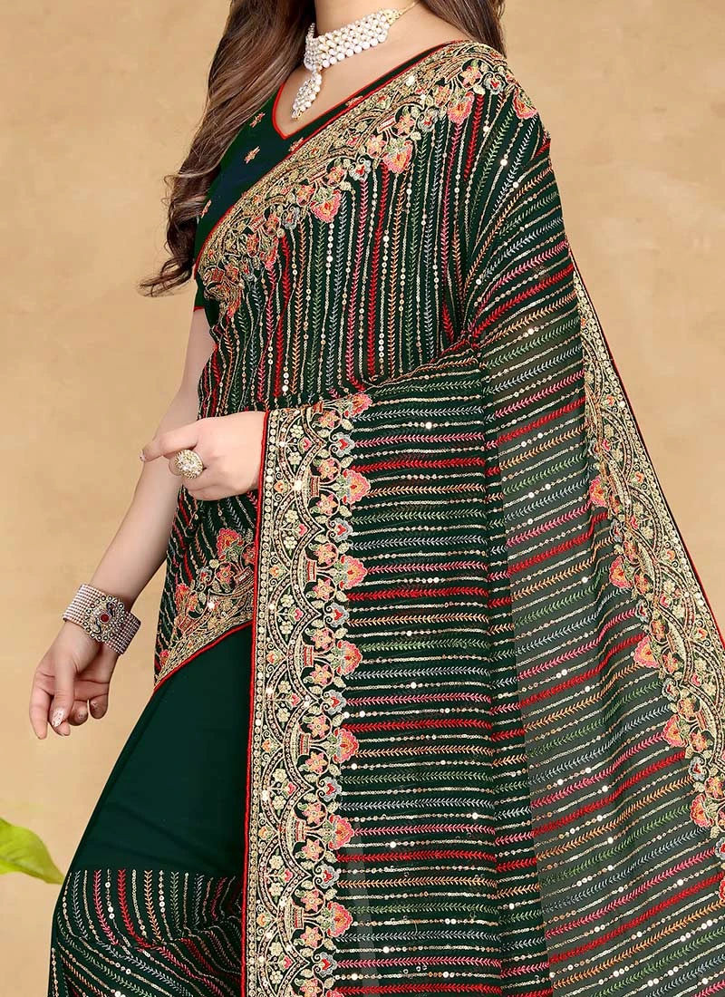 Bottle Green Georgette Zari Embroidery Work Saree Party Wear