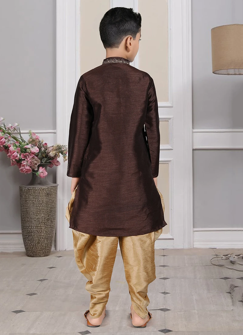 Look stylish and elegant in this brown color art silk kids boys kurta pyjama enriched with embroidered work and crafted with collar neck and full sleeves is representing a royalty in itself. Comes with golden color art silk dhoti bottom.