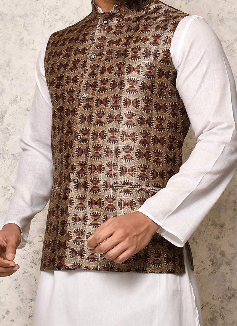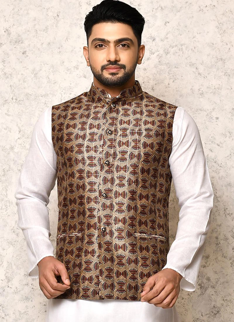 Style and design and pattern will be at the peak with this brown art silk nehru jacket crafted with mandarin collar neck and sleeveless enriched with printed work is representing royalty in itself.