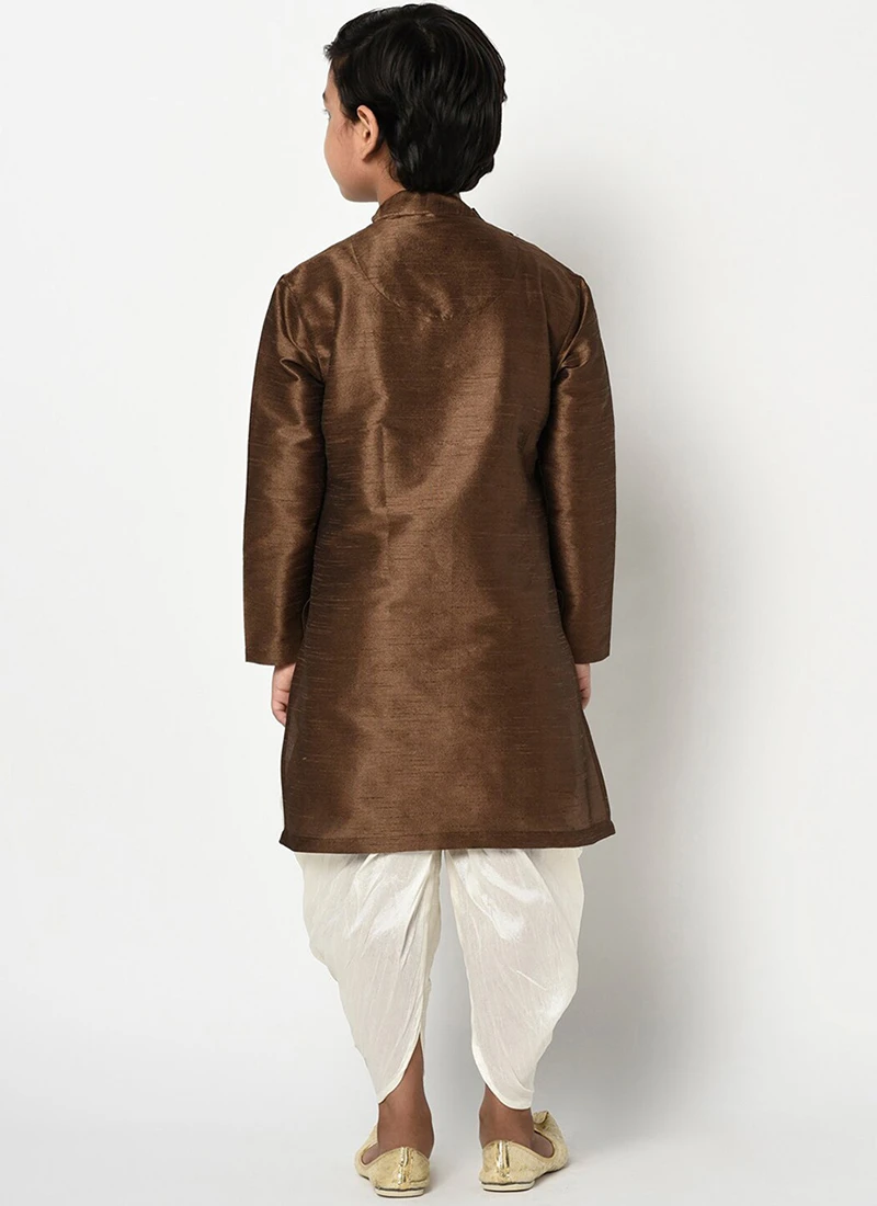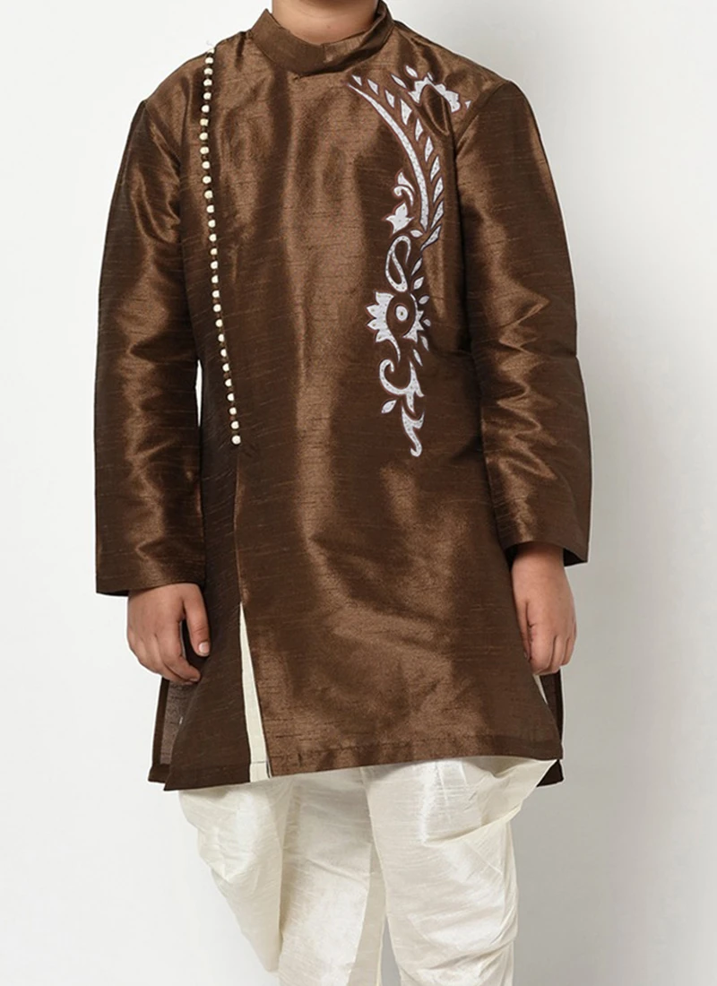 Brown dupion silk kids boys kurta pyjama crafted with mandarin collar neck and full sleeves enriched with embroidered work in the angrakha kurta is representing a royalty in itself. This kurta pyjama comes with white dupion silk dhoti bottom.
