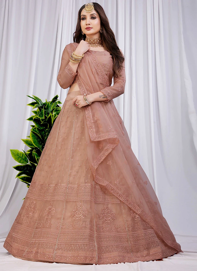 Crafted from highquality net fabric this lehenga features a rich and earthy brown hue that exudes sophistication and warmth. The net fabric drapes gracefully offering a comfortable and flattering fit while adding an element of translucency that creates an aura of mystique.