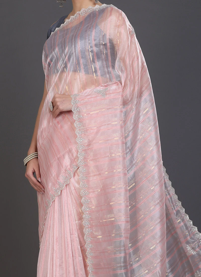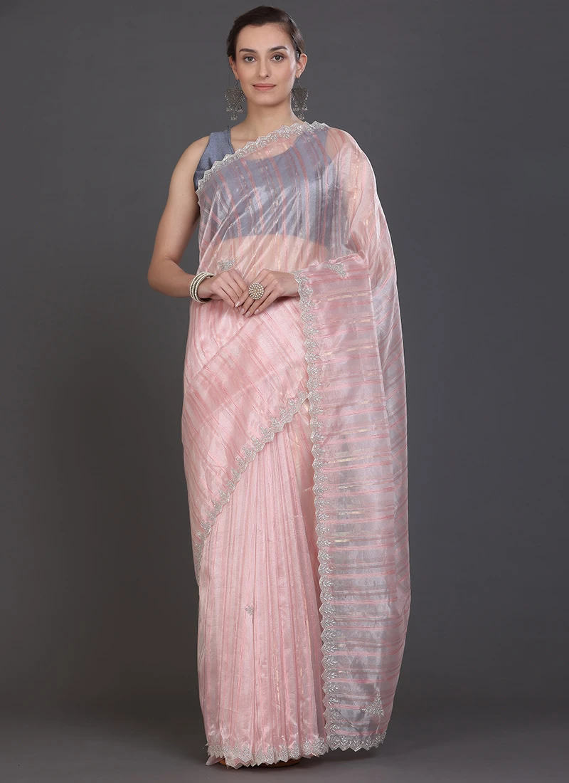 Chiffon Hand Work Beads Work Baby Pink Color Saree Party Wear