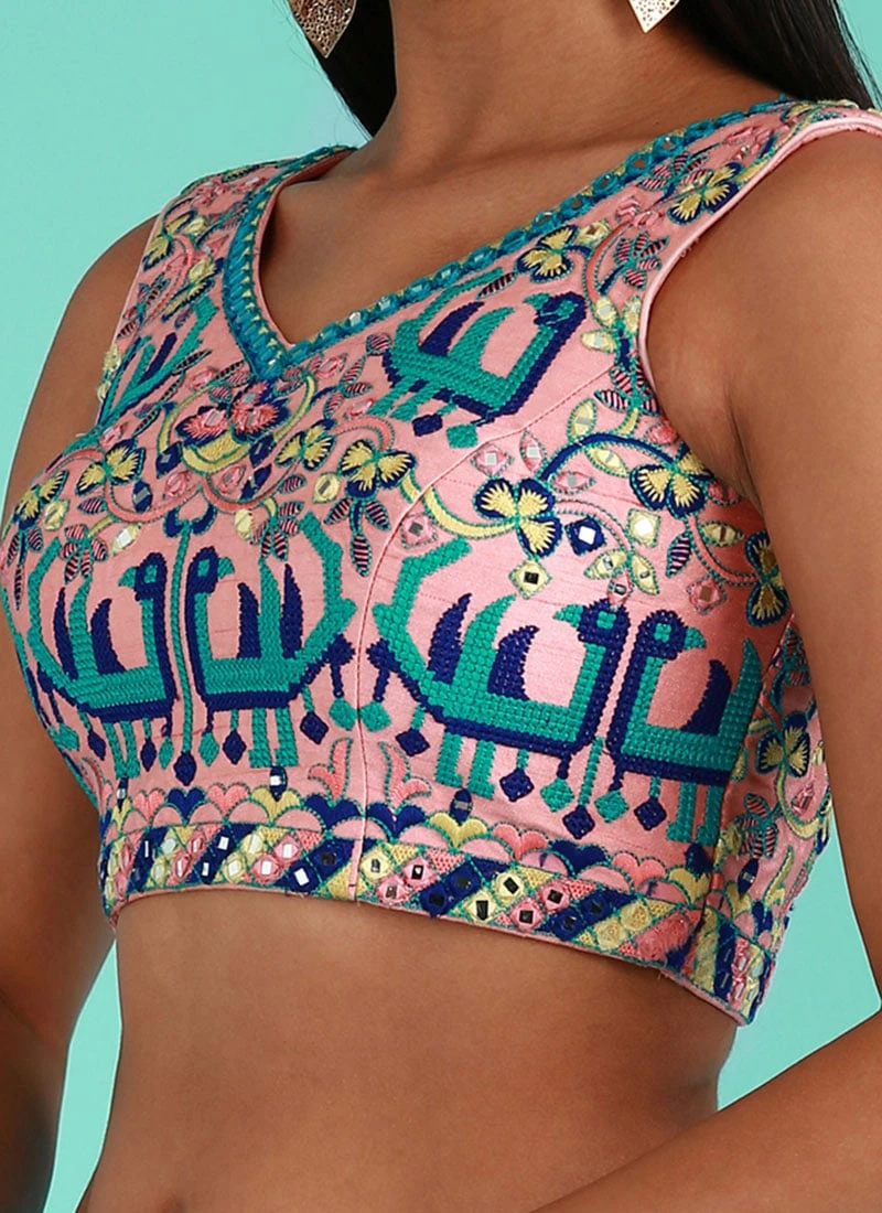 Coral Pink Silk Embroidery Work Blouse Party Wear