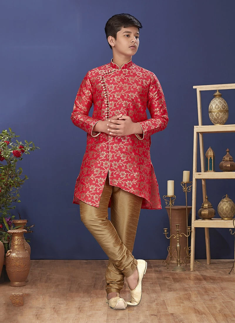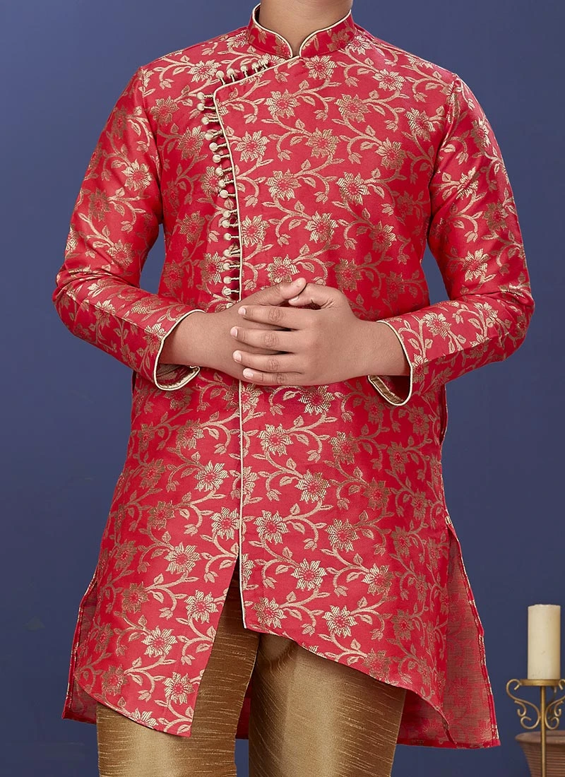 Coral Red Heavy Silk Boys Indowestern Sherwani Party Wear