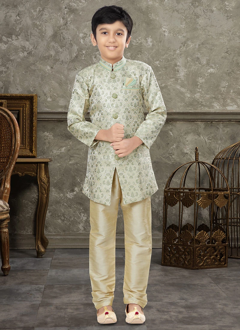 Crafted from highquality art silk jacquard this sherwani boasts a luxurious and soft texture that drapes gracefully. The colour palette is a harmonious blend of cream and green with intricate jacquard weaving that adds depth and dimension to the fabric. The cream base exudes sophistication while the rich green accents provide a pop of colour thats both vibrant and tasteful.
