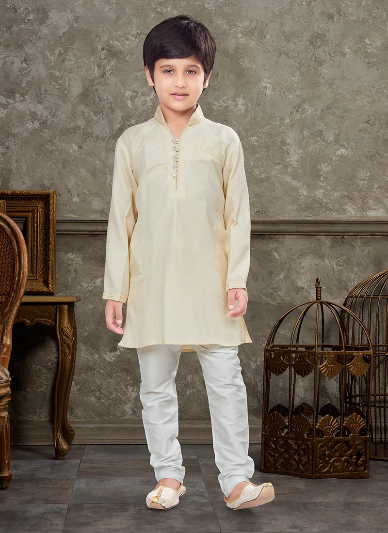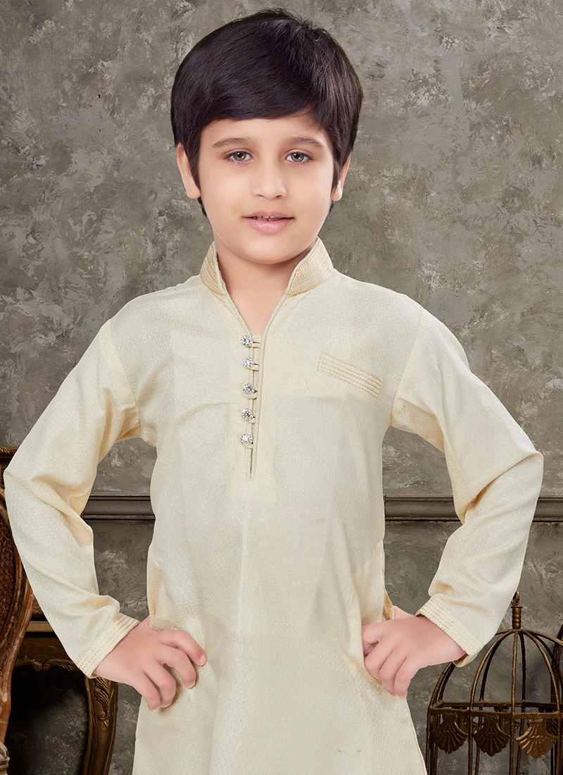 The Cream Art Silk Kids Boys Kurta Pyjama is a delightful ensemble designed to elevate your childs style quotient while ensuring maximum comfort. Crafted with meticulous attention to detail this traditional Indian outfit is perfect for special occasions festive celebrations weddings or any event where your little one needs to look dashing and feel at ease.