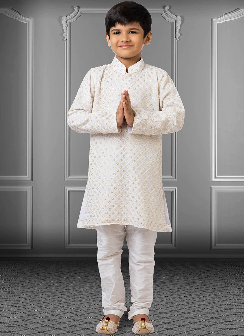 Style and trend will be at the peak with this cream georgette boys kurta pyjama enriched with sequins embroidered work over the kurta crafted with full sleeves and mandarin collar neckstyle is representing a royalty in itself. This Kurta pyjama comes with white dupion silk chudi pant bottom.Fabric : Note: The Lining provided for this kurta pyjama is Cotton.Designs, colors and patterns on the actual product may slightly vary from designs shown in the image. Images are only representative.