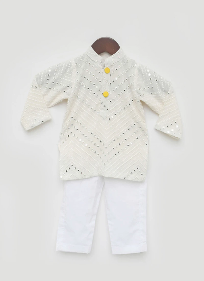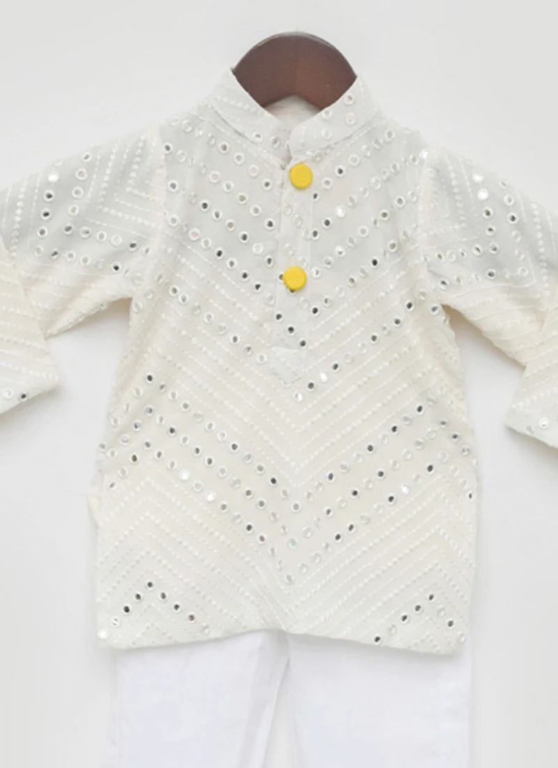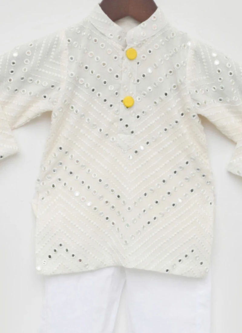 Looking amazing with attachment of cream georgette kids boys kurta pyjama crafted with collar neck and full sleeves. This pretty attire is displaying mirror embroidery work. This kurta Pyjama comes with white cotton silk pant bottom.