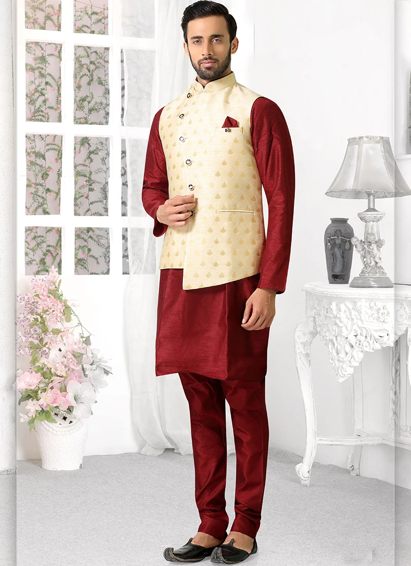 Magnificent cream jacquard silk nehru jacket crafted with mandarin collar neck and sleeveless enriched with embroidered work is representing royalty in itself.