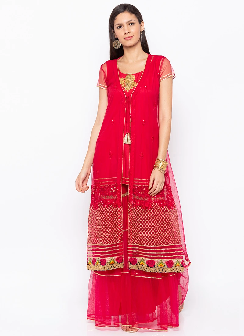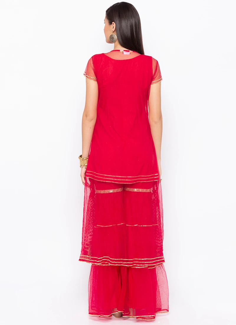Crimson Red Net Embroidered Kurta Sharara Set After Six Wear