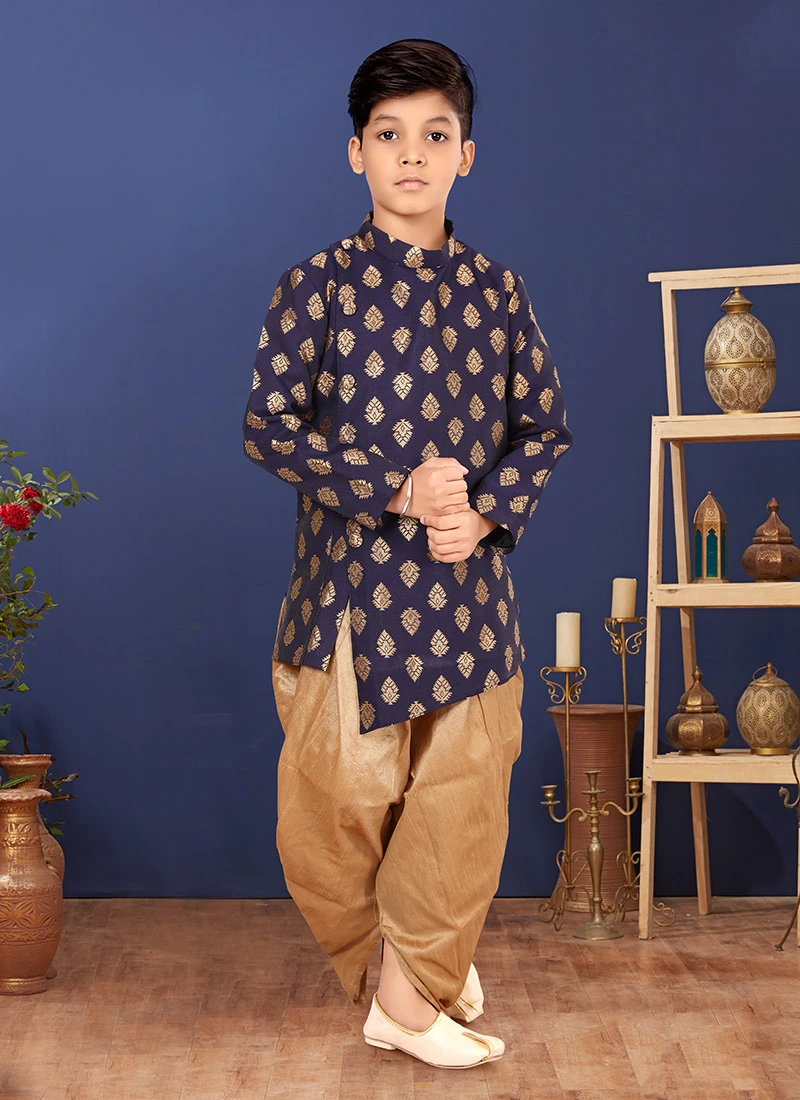 Style and design and pattern will be at the peak with this dark blue jacquard silk boys indowestern sherwani enriched with jacquard work over the sherwani crafted with full sleeves and mandarin collar neckstyle is representing a royalty in itself. This sherwani comes with gold dupion silk dhoti pant bottom.