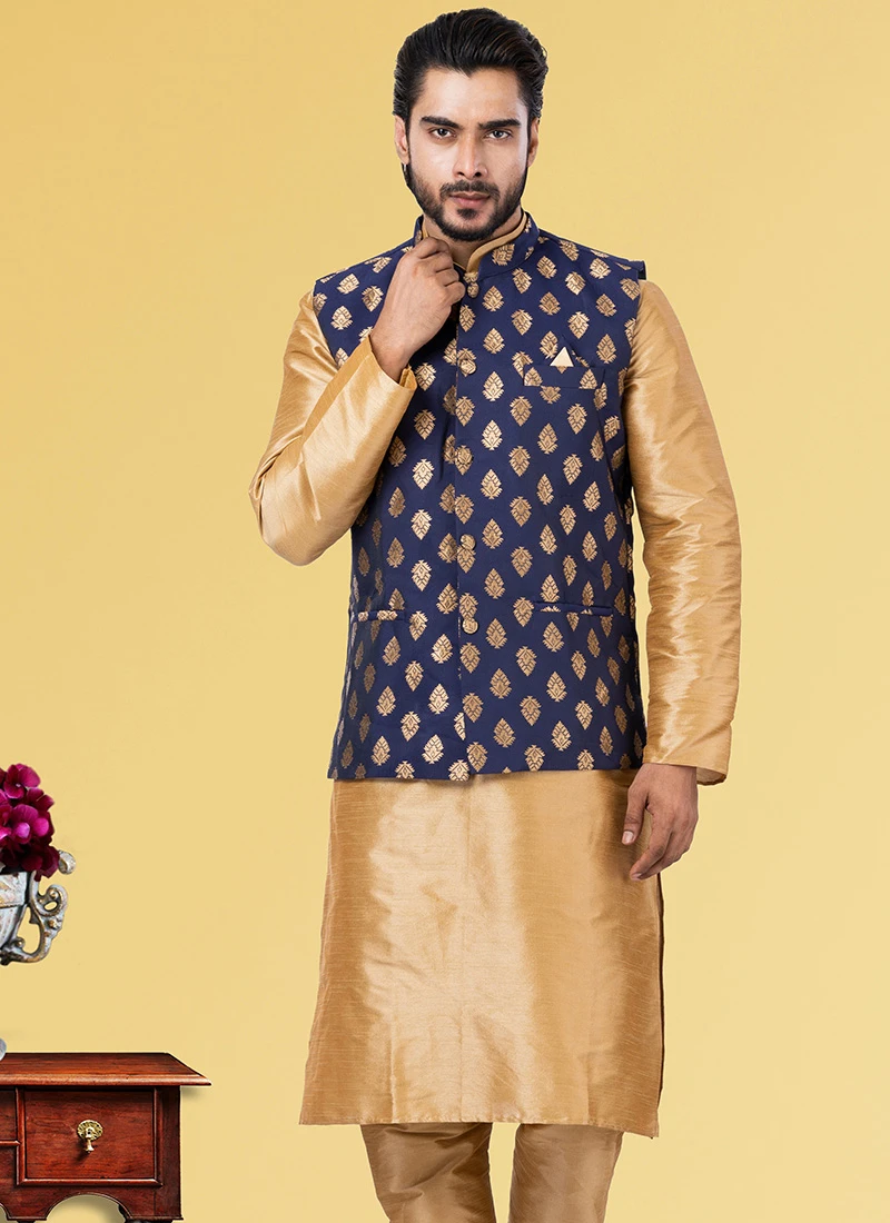 You will be confident to make a impressive fashion statement with this dark blue jacquard silk nehru jacket crafted with mandarin collar neck and sleeveless enriched with jacquard work is representing royalty in itself.