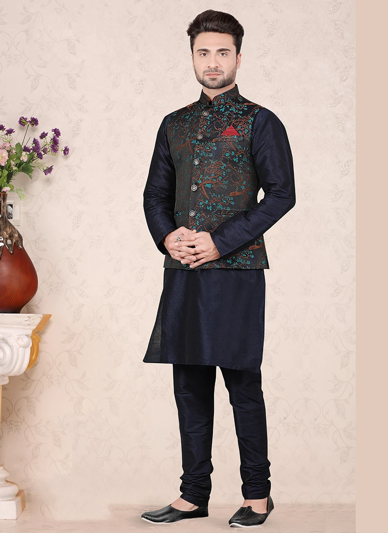 Dark navy blue jacquard silk nehru jacket crafted with mandarin collar neck and sleeveless enriched with printed work is representing royalty in itself.