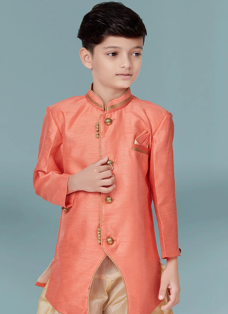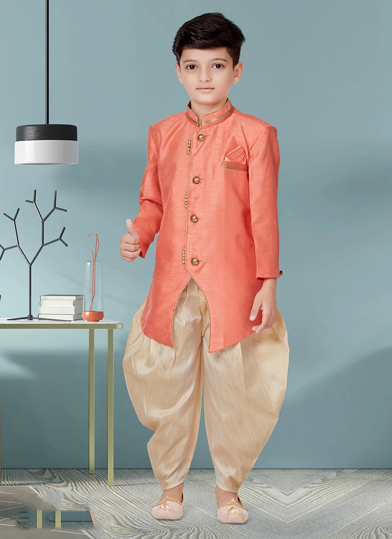 Your child look Pretty in this dark pink silk indowestern sherwani. The plain work appears to be like chic and best for festival. Comes with gold silk dupion dhoti bottom.