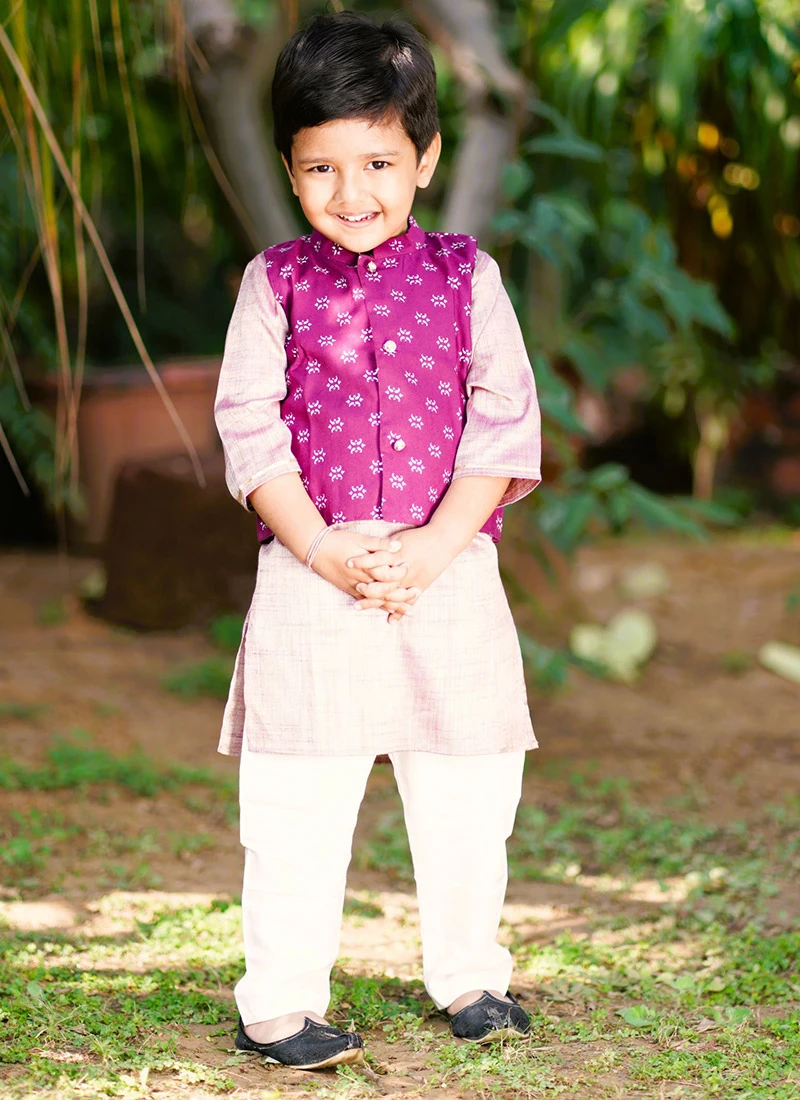Everyone will admire you when you wear this light purple color cotton silk bandi set. This attire is beautifully encrafted with plain work and jacket comes with deep purple cotton with printed motifs nehru jacket. This bandi set comes with off white cotton silk bottom.