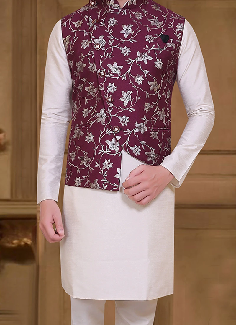 Magnificent deep wine velvet nehru jacket crafted with mandarin collar neck and sleeveless enriched with soild plain work is representing royalty in itself.