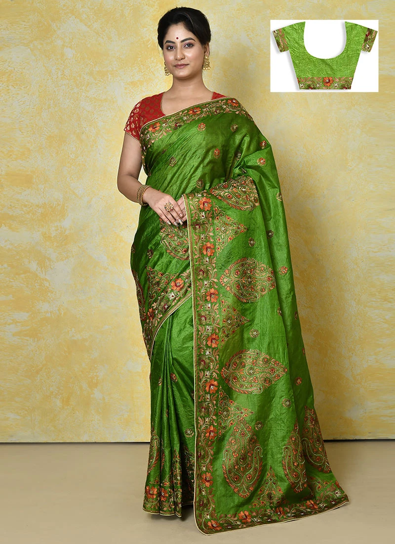 Embroidery Work Mehendi Green Color Pure Silk Tussar Silk Saree Festive Wear